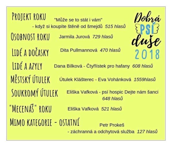 Přátelé, ráda bych vám poděkovala za vaši podporu v anketě Dobrá psí duše. Už samotná nominace v kategoriích „Soukromý útulek“ a „Mecenáš roku“ pro mne byla velkou ctí, a to, že jsme v obou kategoriích dosáhli na nejvyšší příčku je pro mne ohromnou odměnou a zároveň hnacím motorem a motivací do další práce …